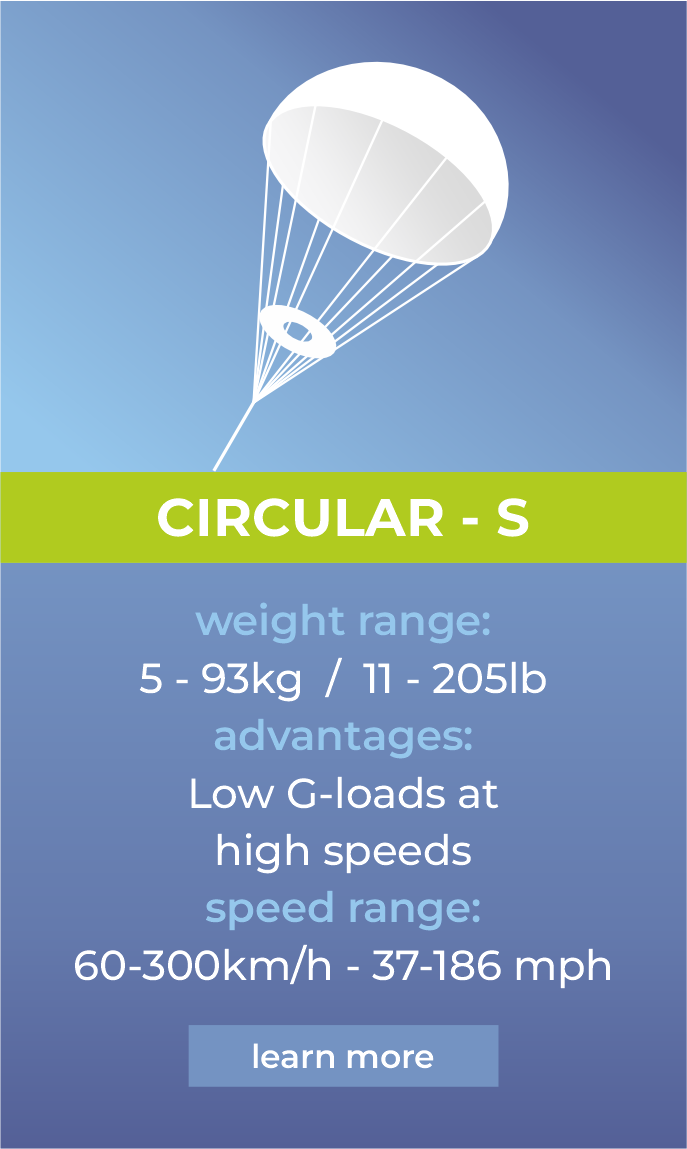 - Standard sizes for MTOW of 0.5 to 93kg with 4-6m/s sink rate, extension of MTOW easily feasible.