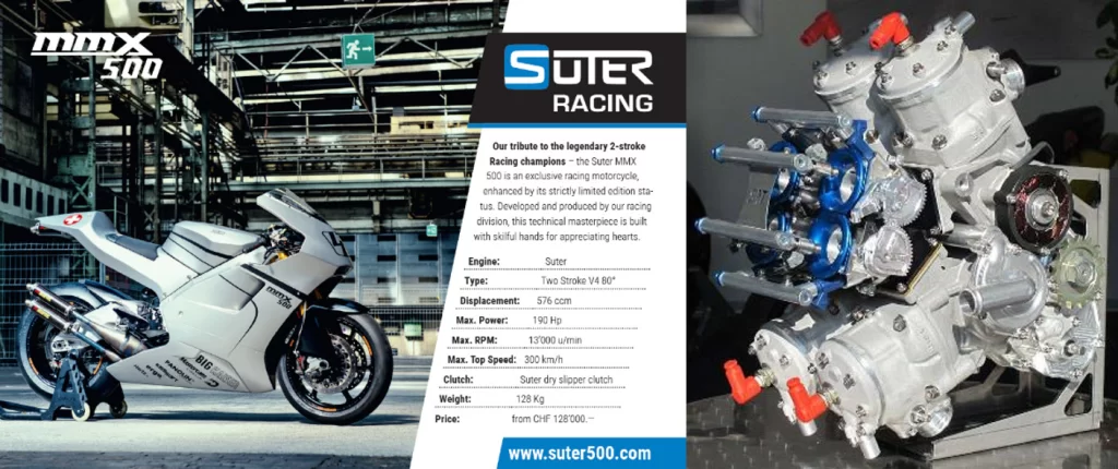 Since 2002, Suter has been using its expertise in high-performance engines for applications outside of racing, including the automotive, aerospace, and defense industries. Suter gained renown for products like the “SuterClutch,” high-performance racing motorcycles, and 2-stroke engines, notably the Suter MMX500 (launched in 2015).